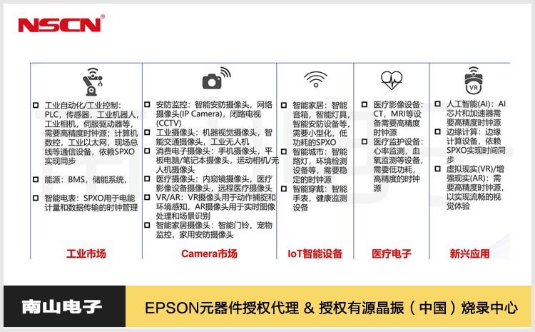 2025-03-28愛普生SG2016CAN、SG-210STF和可編程晶振系列擁有豐富的市場應用SPXO(Small Package Crystal Oscillator,小型封裝晶體振蕩器)是一種高精度的時鐘源,廣泛應用于各種電子設備中。根據提供的圖片,SPXO的市場應用非常廣泛,涵蓋了工業市場、Camera市...